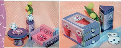 Também com as caixinhas de fósforo, as meninas, depois de forrá-las, podem fazer a mobília da casinha de bonecas, como mostra a imagem abaixo.