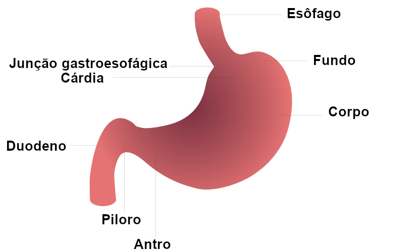Podemos identificar quatro partes básicas nele: a cárdia, o fundo, o corpo e a região pilórica.