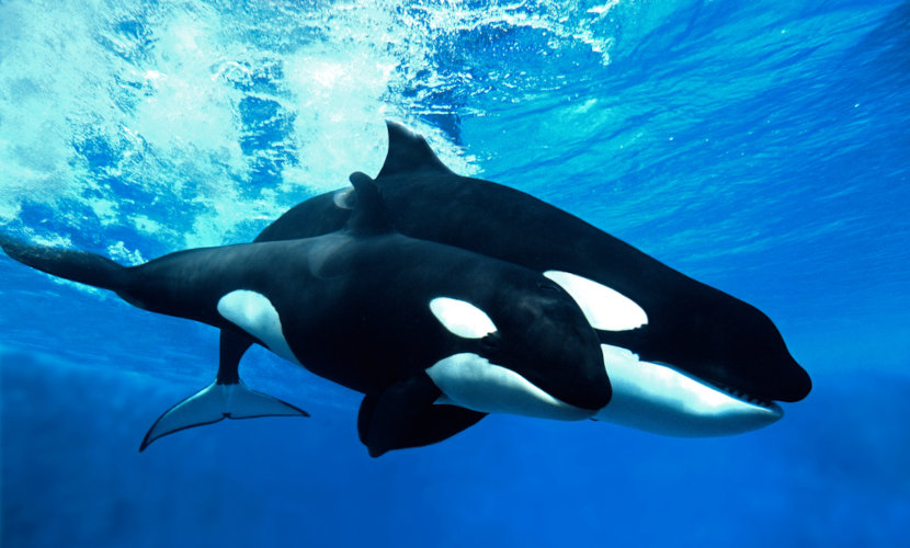 Orca (Orcinus orca): diferentemente do que muitos pensam, a orca não é verdadeiramente uma baleia, apesar de ser chamada frequentemente de “baleia assassina”. A espécie faz parte da família Delphinidae. A orca possui alta nadadeira dorsal, sua cabeça é arredondada, e apresenta uma coloração característica preta e branca. O macho é maior que a fêmea, podendo atingir nove metros de comprimento.