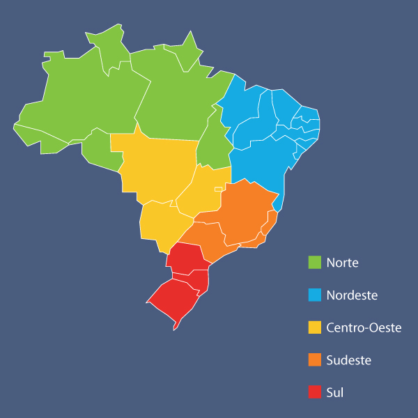 O território brasileiro é dividido em cinco grandes regiões, as quais foram definidas com base em aspectos socioeconômicos e físicos. São elas: Norte, Nordeste, Centro-Oeste, Sul e Sudeste.