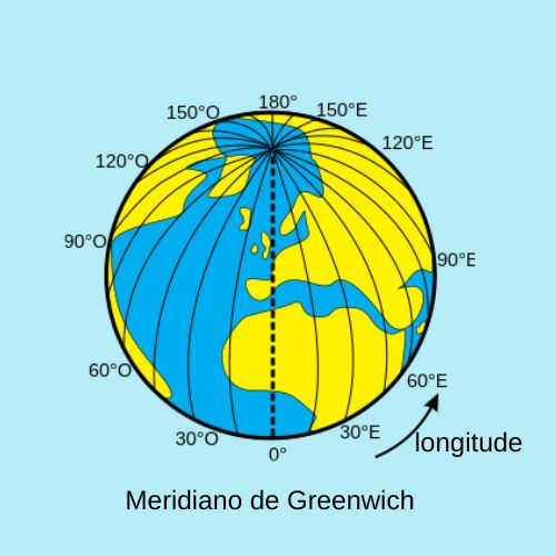 Longitude: permite a divisão do planeta nos hemisférios Leste e Oeste, e é utilizada no estabelecimento das diferentes zonas horárias ou fusos horários da Terra. Cada fuso horário representa um intervalo de 15º de longitude. Para a melhor orientação e contagem do tempo, foram estabelecidos os meridianos notáveis: Greenwich (0º de longitude) e a Linha Internacional da Data (180º de longitude).