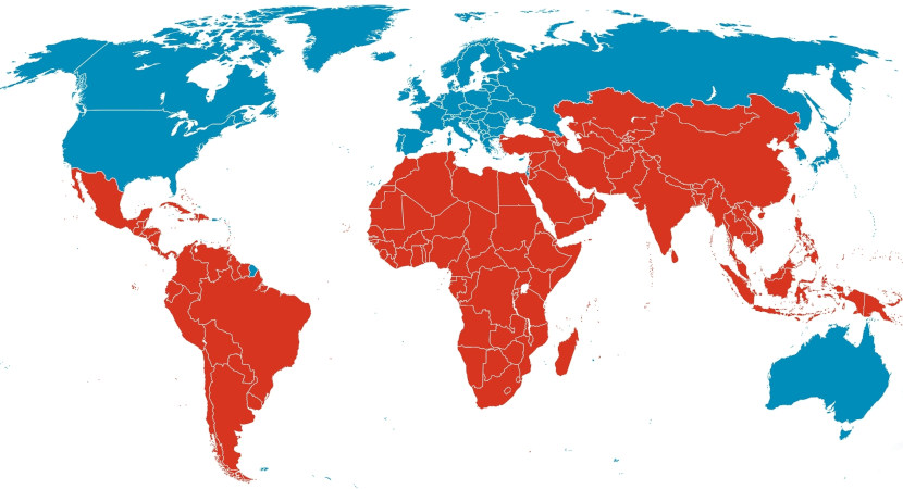 Os países em azul, no mapa, formam a região dos países desenvolvidos, que apresentam os maiores índices de desenvolvimento humano, econômico e social. Já os países em vermelho são aqueles considerados emergentes ou subdesenvolvidos, com as piores condições de vida entre suas populações. Essa divisão representa uma das muitas formas possíveis de regionalizar o mundo.