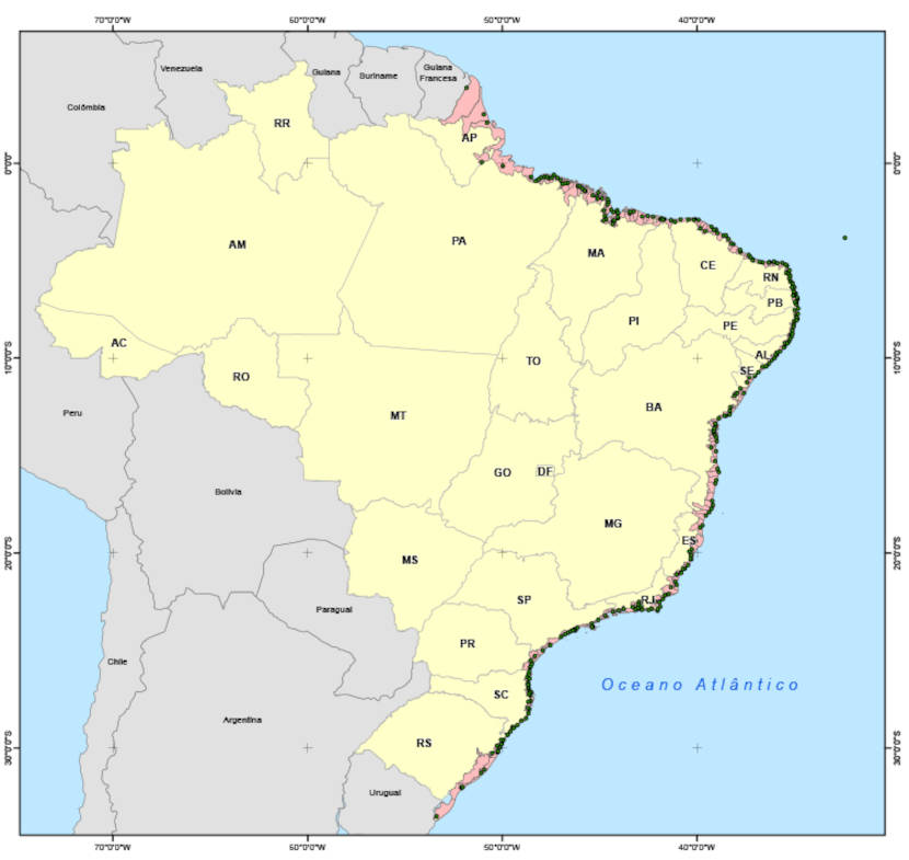 O Oceano Atlântico é o único oceano que banha o território brasileiro. Suas águas abrangem todo o litoral do Brasil, que se estende desde o estado do Amapá, na região Norte, até o estado do Rio Grande do Sul, na região Sul, e tem extensão de 7367 km. Ao todo, são 17 estados e 279 municípios banhados pelo Oceano Atlântico, os quais estão destacados no mapa da imagem a seguir: