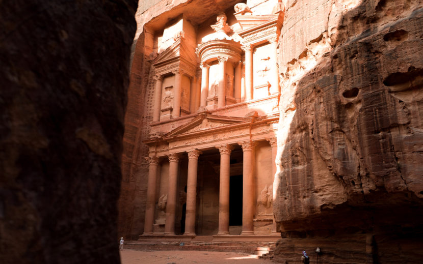 Petra é uma cidade localizada na Jordânia, na região entre o Mar Morto e o Mar Vermelho, construída pelos árabes nabateus por volta do século IV a.C. Também chamada de Cidade Rosa, a cidade é conhecida pelos seus edifícios que foram esculpidos em paredes rochosas de arenito. As construções de Petra são uma das poucas que foram edificadas de cima para baixo, uma vez que os operários, utilizando andaimes, começavam a esculpir no que seria o topo do edifício. A cidade de Petra também possuía um complexo sistema de captação e armazenamento de água da chuva.