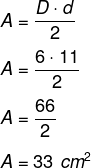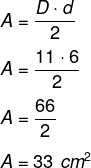 Sabendo que d = 6, então temos que D = 2 · 6 – 1 = 12 – 1 = 11 cm. Calculando a área, temos que: