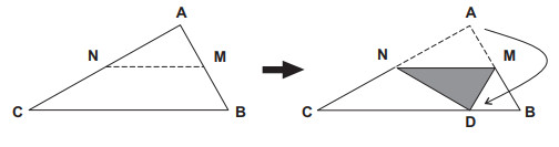 (Enem) Um professor, ao fazer uma atividade de origami (dobraduras) com seus alunos, pede para que estes dobrem um pedaço de papel em forma triangular, como na figura a seguir, de modo que M e N sejam pontos médios respectivamente de AB e AC, e D, ponto do lado BC, indica a nova posição do vértice A do triângulo ABC.