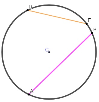 Corda e diâmetro: corda é qualquer segmento de reta que possui as duas extremidades na circunferência. Já o diâmetro é uma corda que passa pelo centro da circunferência, sendo a maior corda dessa figura.