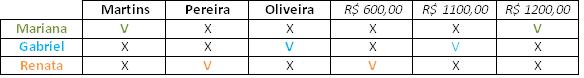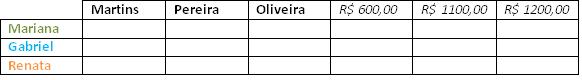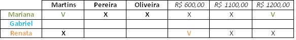 Veja que não marcamos nenhum sobrenome para a Renata, pois ainda não o conhecemos. Agora buscando a segunda pista, saberemos qual sobrenome é responsável pela quantia de R$1100,00. Com isso, sobrará apenas um sobrenome para a quantidade de R$ 600,00, da Renata.