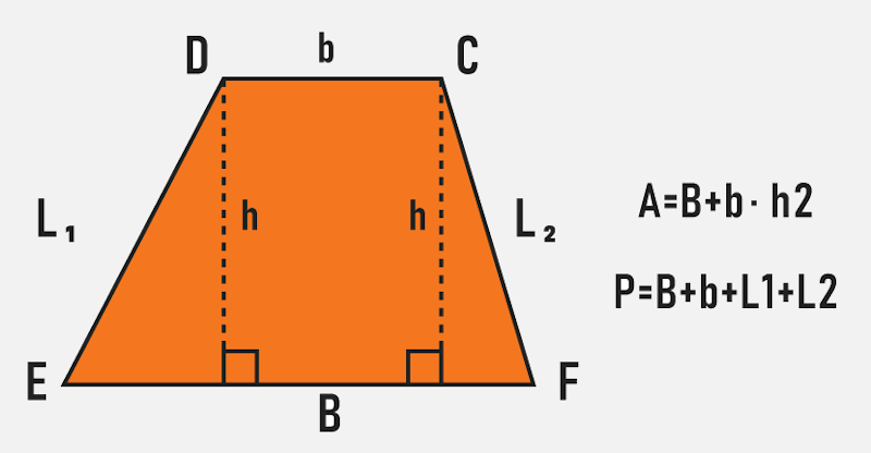 O trapézio é um quadrilátero que possui dois lados paralelos e os outros dois lados não paralelos. Para calcular a sua área, é necessário conhecer o comprimento da base maior, da base menor e da altura. Para descobrir o seu perímetro, não há fórmula específica, sendo este calculado pela soma das suas bases com os lados oblíquos.