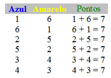 Com base nessa primeira jogada resolveram determinar quais as combinações nas quais a soma das faces resultasse em 7 pontos. Observe: