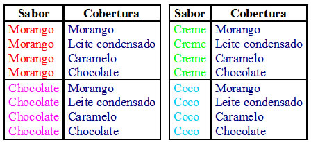 A sorveteria oferece 4 sabores de sorvete e 4 tipos de cobertura.