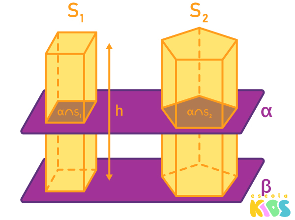 Sejam S1 e S2 dois sólidos geométricos de mesma altura h com bases congruentes sobre um plano β. Considere um plano α arbitrário, paralelo a β , que é secante aos dois sólidos, conforme a imagem.