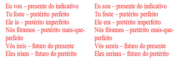 São aqueles que, durante a conjugação, apresentam profundas alterações no radical, como é o caso dos verbos “ir” e “ser”. Vamos realizar mais uma tarefa de conjugá-los? Desta vez em tempos distintos, referentes ao modo indicativo: