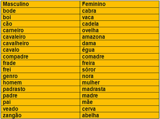 Assim, o que iremos aprender a partir de agora se refere àqueles substantivos que possuem radicais distintos (tanto na forma masculina quanto na feminina), diferentes de alguns casos, como: